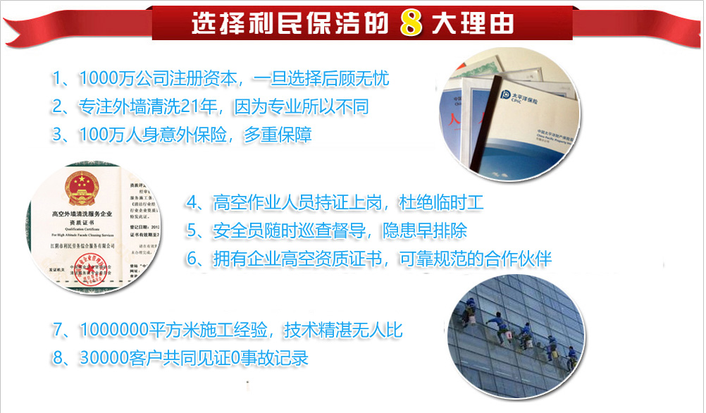 我們的外墻清洗業(yè)務(wù)包括:外墻清潔、外墻防水補(bǔ)漏、外墻涂料粉刷、LED樓體亮化工程高空安裝、外墻防水工程高空施工等系列高空作業(yè)項(xiàng)目,是物業(yè)公司、景觀工程公司、廣告公司、建筑、安裝公司、幕墻公司、各企事業(yè)單位等最佳高空作業(yè)服務(wù)專業(yè)供應(yīng)商.專業(yè)安全高效,承包高空外墻清洗,.專業(yè)的施工團(tuán)隊(duì),所有人員均持證上崗,高空人員均購(gòu)買100萬(wàn)保險(xiǎn),21年1000000平方的外墻清洗經(jīng)驗(yàn),優(yōu)質(zhì)的服務(wù)..[詳細(xì)]
